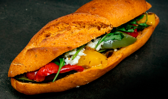 Aubergine, courgette, pepper, red pesto & rocket on baguette